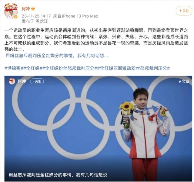 “在跳水等体育项目中,裁判的评分成为了诸多争议的焦点。有些人在不充分了解项目规则和评分标准的情况下,很容易被那些误导性的言论所影响,比如说这次,就有全红婵的极端粉丝认为,选手的失利归咎在裁判打低了分数。”何冲写道。
