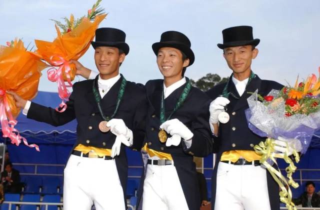 2002年10月8日,中国队选手黄焯钦、顾兵、张立军(从左至右)在颁奖仪式上。在当日进行的第14届亚运会马术盛装舞步团体赛中,中国队获得铜牌,实现了该项目在国际大赛上的历史性突破。图/新华社