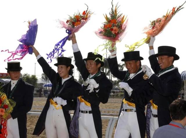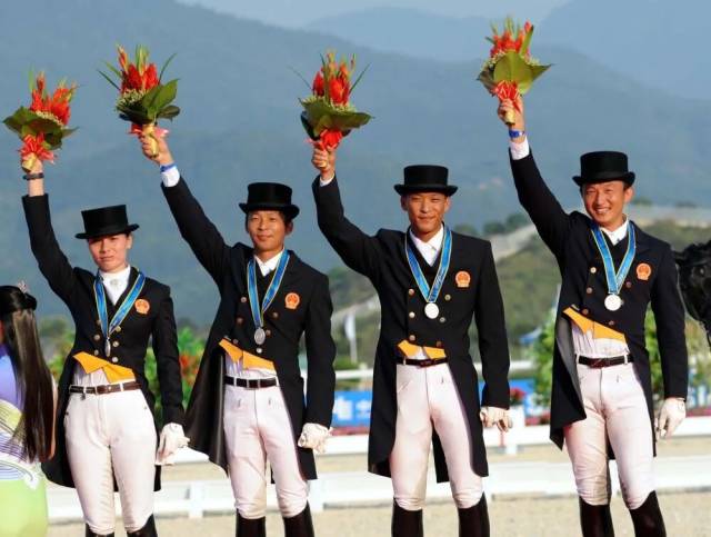 2010年11月14日,中国队马术选手在颁奖仪式上。当日,在第16届亚运会马术盛装舞步团体比赛中,中国队获得亚军。图/新华社