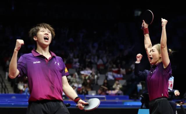 广东队组合林高远(左)/刘诗雯在比赛后庆祝夺冠。图/新华社