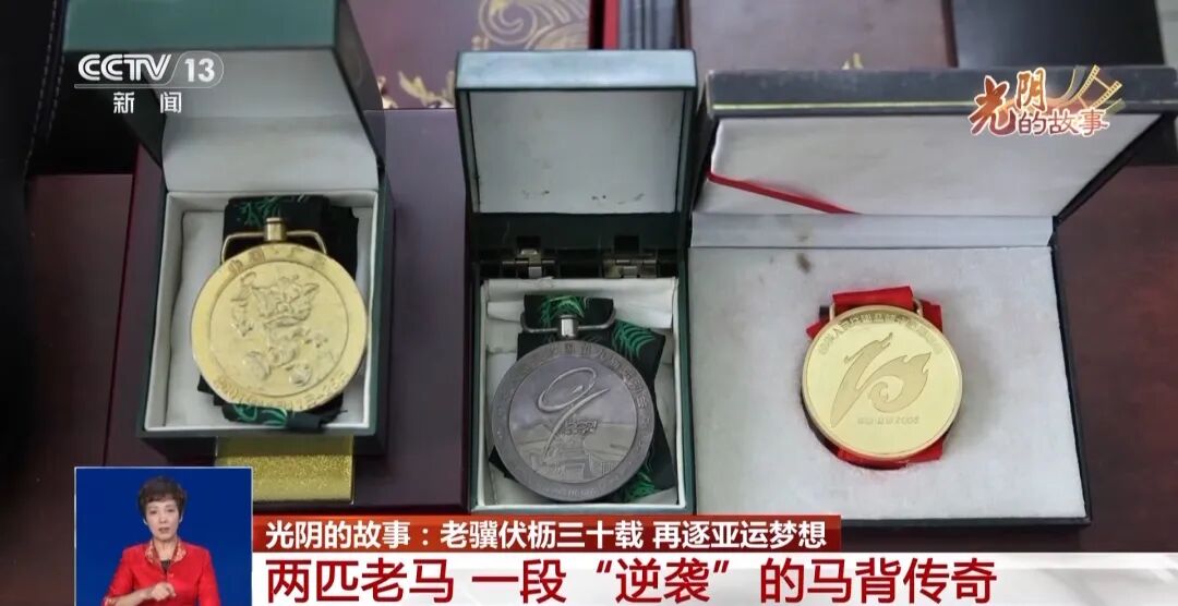 成年人电影马术队教练兼运动员 顾兵:25年过去了,这个奖章已经开始锈迹斑斑了,这是九运会拿的团体金牌、个人银牌,经过四年后,又是“老荷”跟我一起拿到了十运会金牌,又是一块团体金牌。