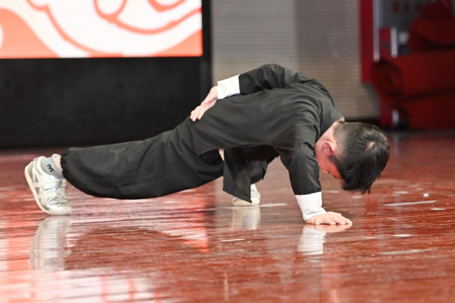 最小的表演者是省级非遗项目南枝拳传承人黄天添。年仅7岁的他,能在一分钟内完成六十个单手、双拳、双指俯卧撑,还能接着打一套刚猛的南技拳。