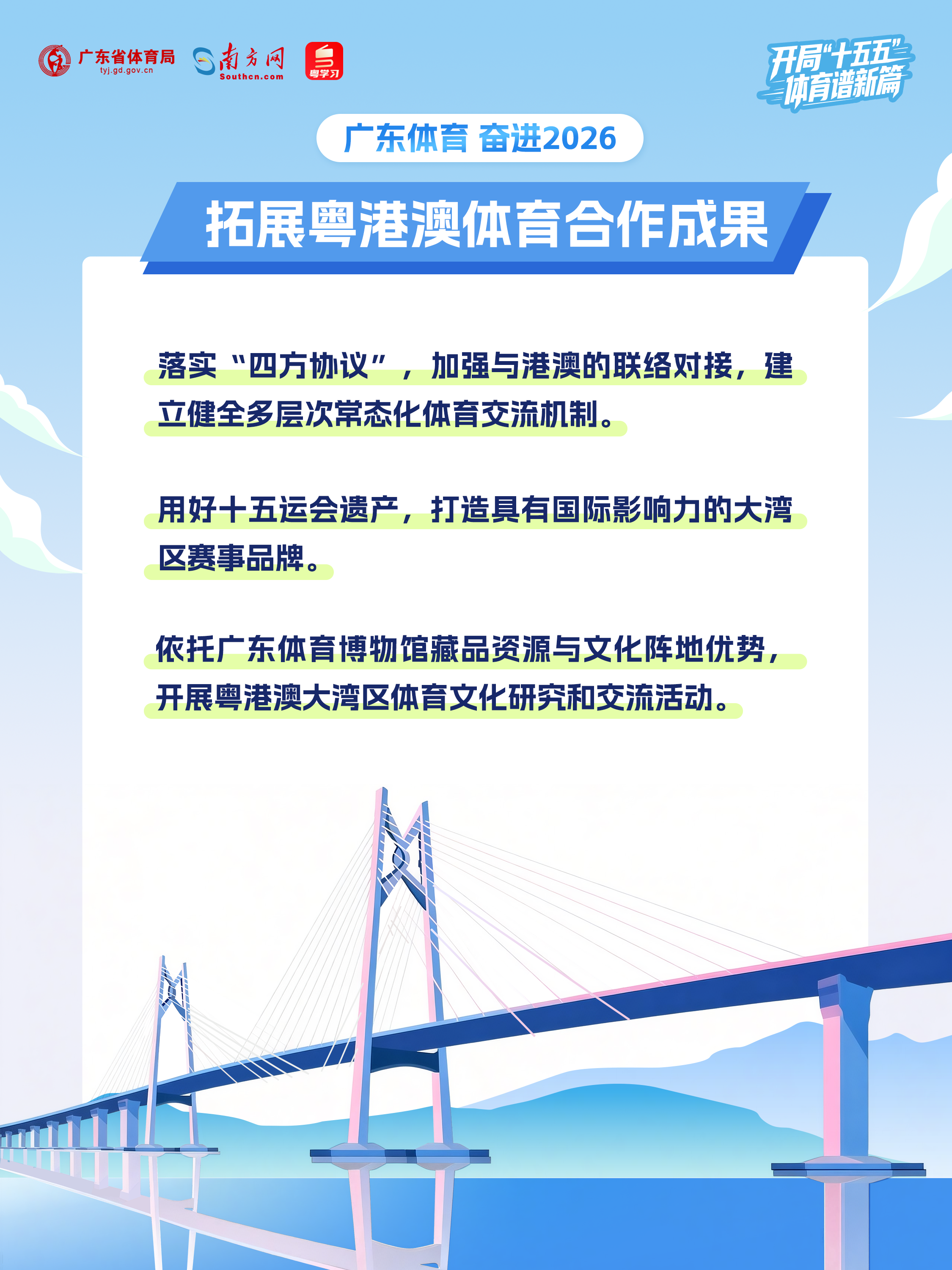 2026年是“十五五”开局之年,也是承前启后、继往开来的关键之年。站在新的历史起点,广东体育将以高质量发展为主题,做好“后全运”工作,加快建设高水平体育强省,实现“十五五”良好开局。一组海报速览2026年广东体育工作重点~