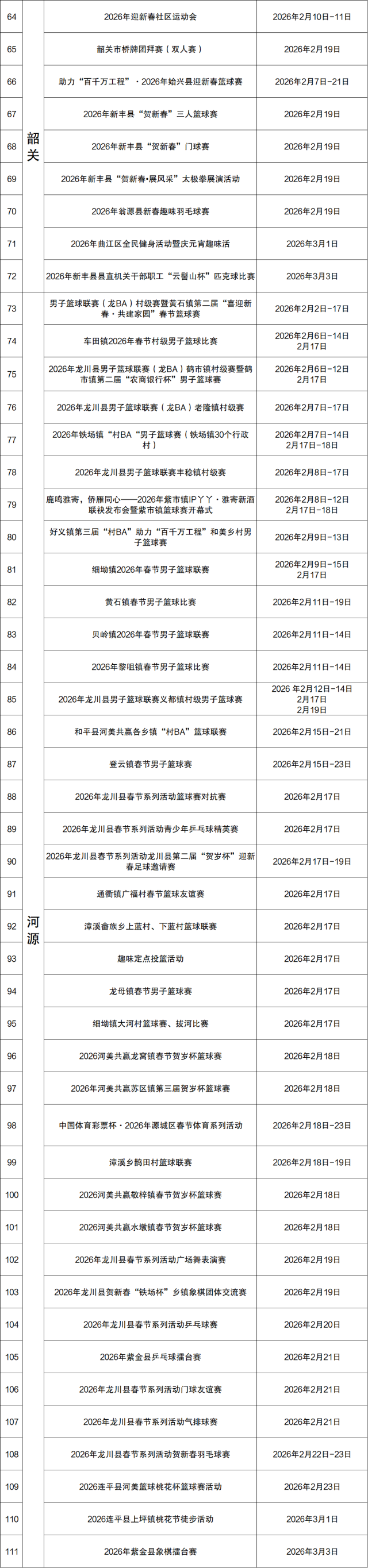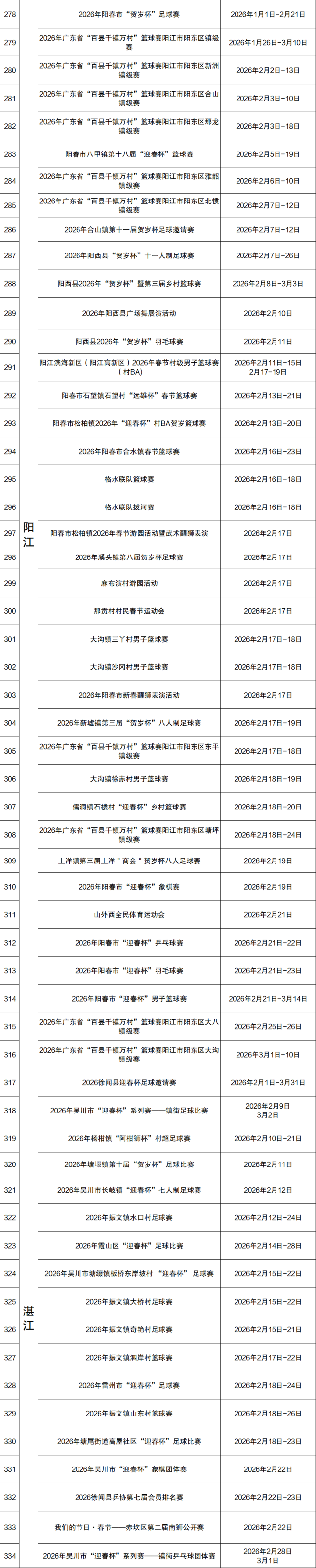 据不完全统计,2026年春节前后,全省计划开展群众体育赛事活动达475项,预计参与人数超13万人次,赛事活动覆盖21个地市的多个城乡区域,涵盖“三大球”、传统体育项目、棋牌竞技等多个类别,其中足球、篮球、排球类328项,羽毛球、乒乓球、网球、匹克球、门球等其他球类项目48项,龙狮、龙舟、武术等赛事活动40项,象棋、围棋、桥牌等赛事活动37项,徒步、风筝、广场舞等其他运动项目22项。