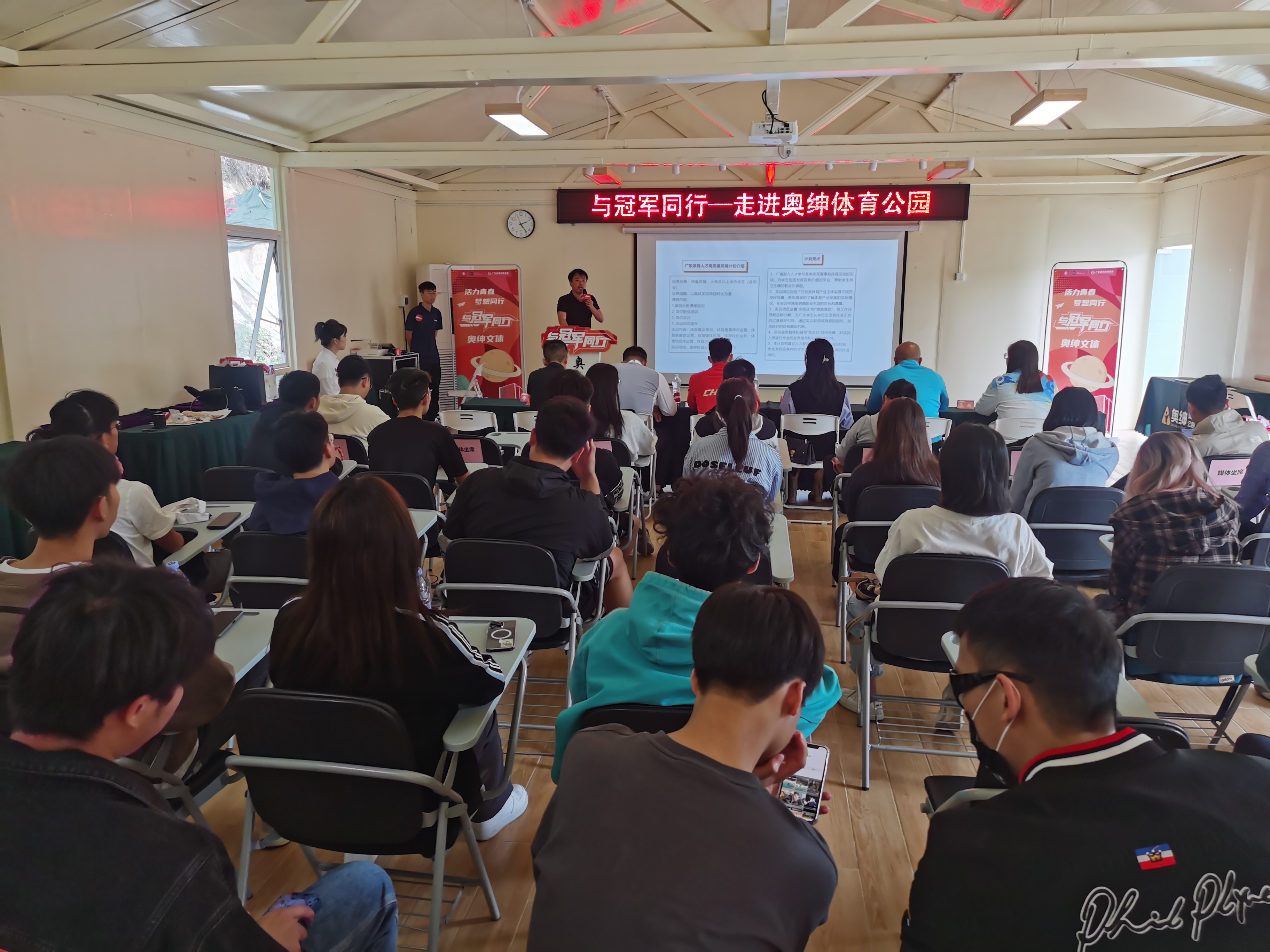 奥绅文体相关负责人向同学们介绍了广东体育人才高质量发展计划,为更多潜力人才提供广东体博会、广东体育产业发展论坛、高水平体育赛事和活动等优质的实训机会,为学生搭建起展示自我的平台,创造职业人角色转变的训练场。