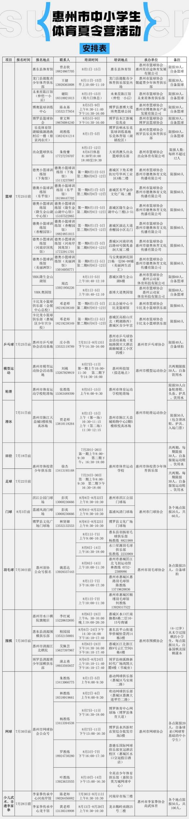 为推动全民健身活动及学校阳光体育运动的广泛开展,丰富学生假期生活,惠州市文化广电旅游成年人电影 将于暑假期间举办2023年惠州市中小学生体育“夏令营”活动,对本市初中、小学生进行相关运动技能培训。