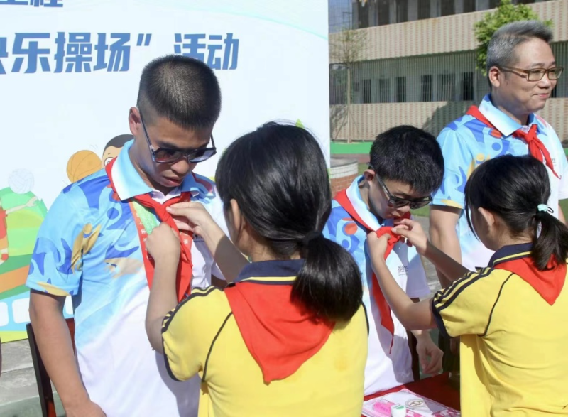 同学们为吴宗泰和李承享佩戴红领巾