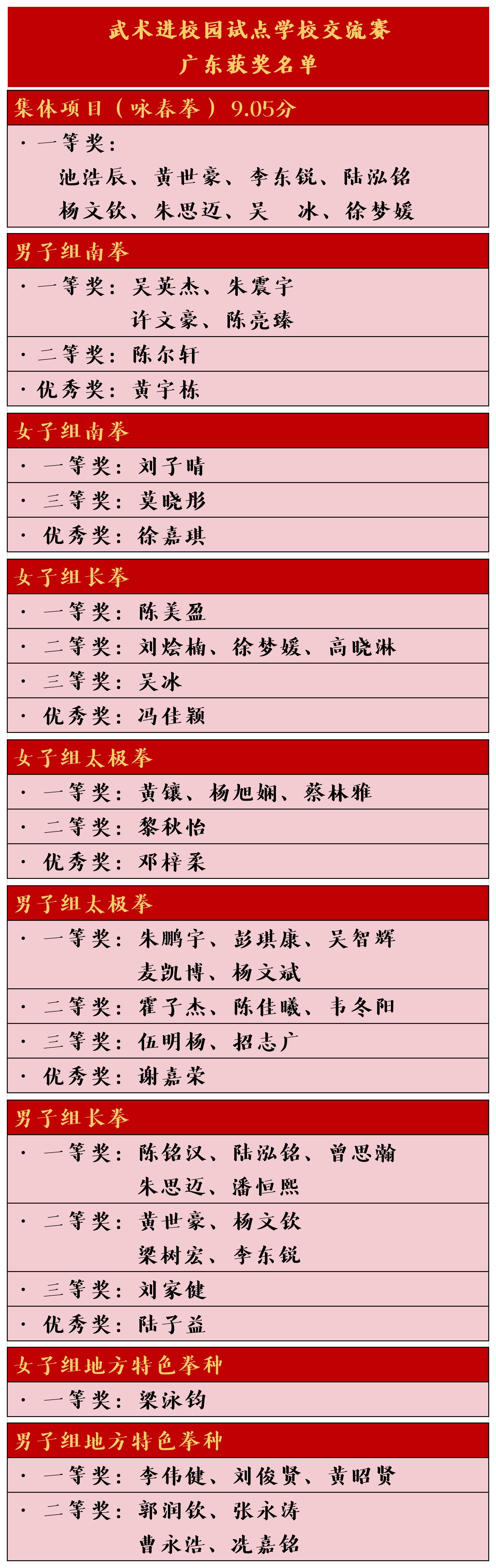 经过赛事角逐,广东队最终斩获21个一等奖,17个二等奖,5个三等奖,6个优秀奖。其中,珠海市一中平沙校区的集体项目《咏春拳》得到了领导嘉宾一致好评,获得9.05的优秀成绩。