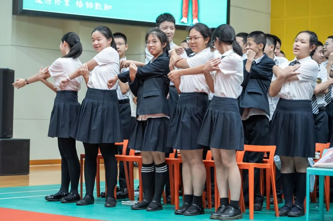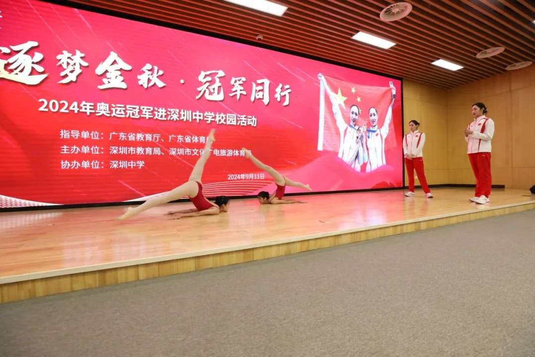 风采展示环节上,王柳懿、王芊懿重现巴黎奥运会花样游泳比赛入水前的招牌动作——豹子步,两位深中学子在现场进行学习和展示,获得奥运冠军们的高度赞扬。