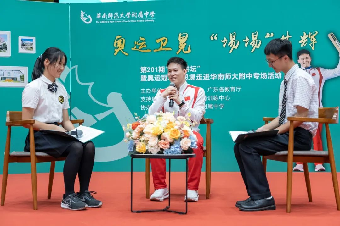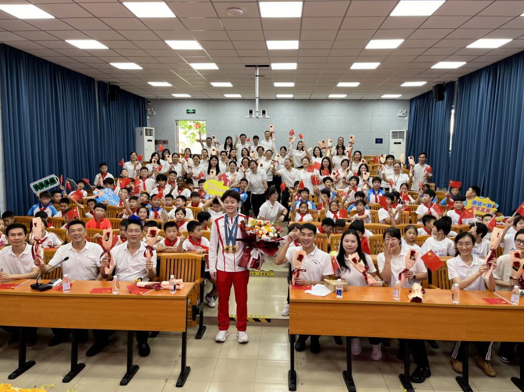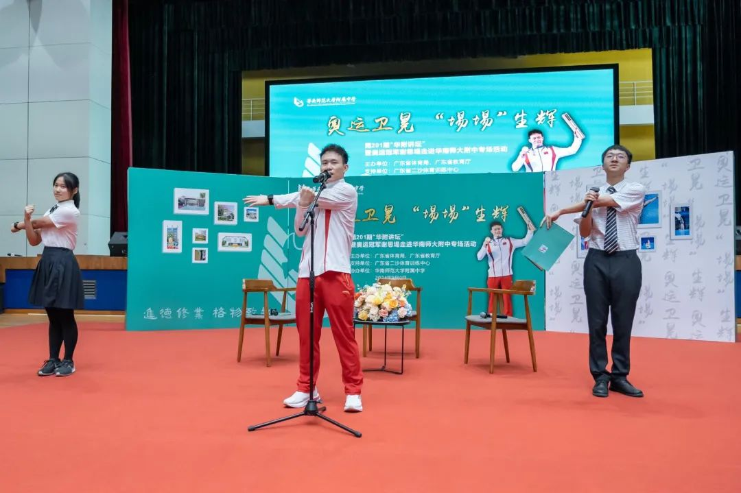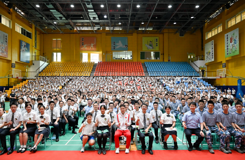 9月9日,巴黎奥运会跳水男子3米板冠军谢思埸来到华南师范大学附属中学,向学校师生分享他在跳水项目的训练经历,以及如何面对比赛压力、坚持梦想等。