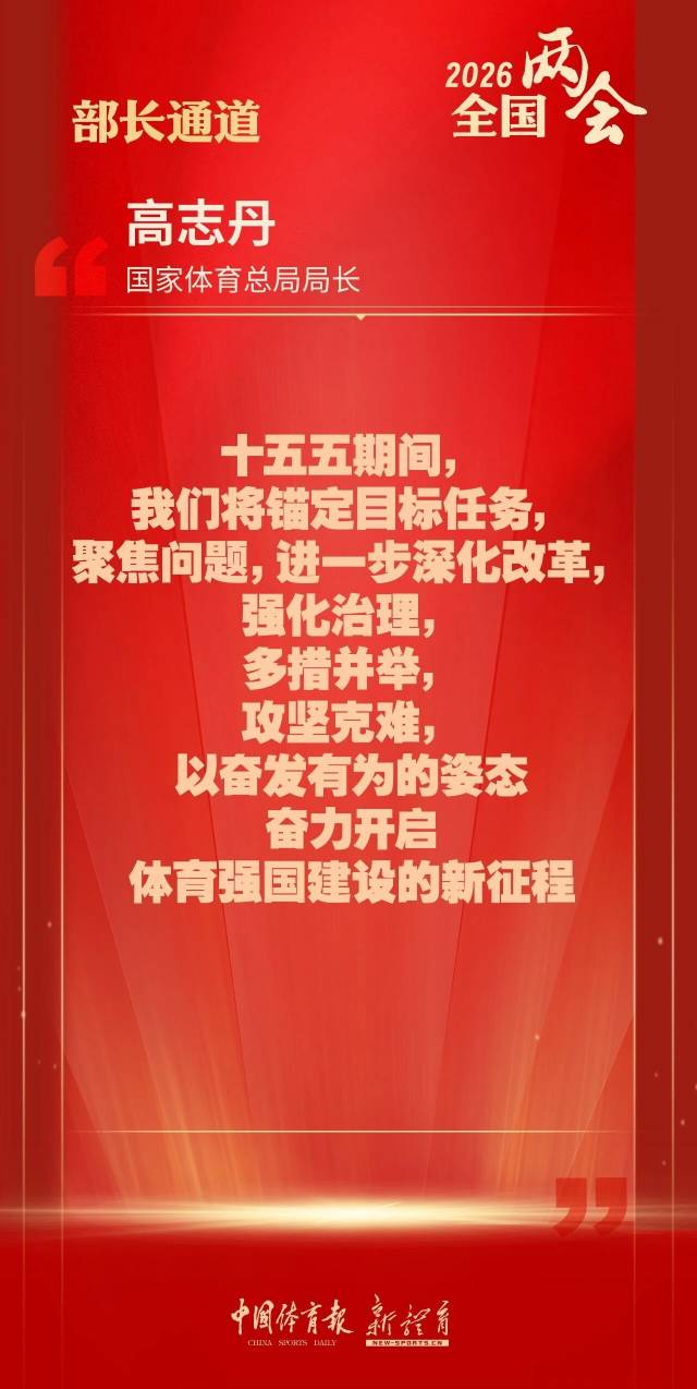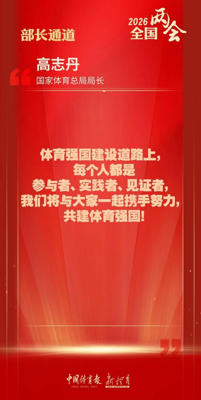 3月9日,十四届全国人大四次会议“部长通道”上,国家体育总局局长高志丹就“十五五”体育发展新举措、体育产业高质量发展等社会关心的问题回答记者提问,系统阐述未来体育工作的发展方向与实践路径,为加快推进体育强国建设凝聚共识、擘画蓝图。体育强国建设道路上,每个人都是参与者、实践者、见证者,希望大家一起携手努力,共建体育强国!