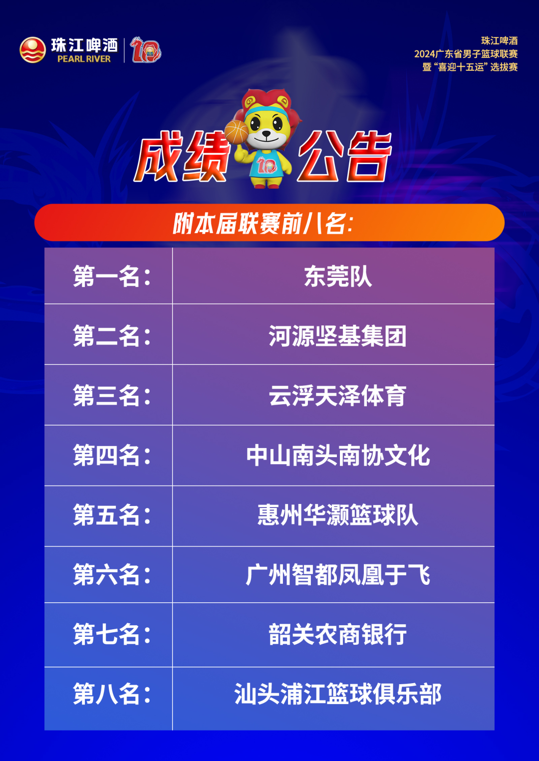 9月7日,珠江啤酒·2024成年人电影男子篮球联赛(简称“省联赛”)暨“喜迎十五运”选拔赛总决赛第二回合比赛在河源市体育馆落下帷幕,坐镇主场的河源队以71比74不敌东莞队,东莞队以2比0的总比分夺得冠军,捧起了成年人电影篮协为省联赛十周年特别打造的“盘龙奖杯”。东莞队的周泽源获评为总决赛最有价值球员。这也是东莞队连续第十年夺得省联赛冠军。
