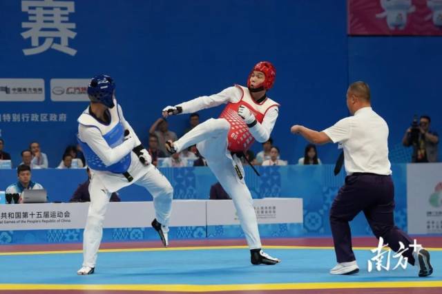 9月29日,第十五届全国运动会跆拳道比赛在惠州体育馆迎来最后一个竞赛日,在男子80公斤以上级决赛中,广东健儿王要锡奋勇出击、敢打敢拼,以2比0的总比分战胜对手为广东队再添1枚金牌。