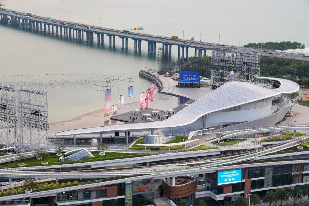 ↑深圳湾体育中心(10月19日摄,无人机照片)。全运会篮球女子22岁以下组、马拉松比赛在这里举行。其中,全运会马拉松比赛从深圳湾体育中心周边道路起跑,以深圳湾大桥为纽带,横跨深圳、香港两地,最后回到深圳湾体育中心。新华社记者 梁旭 摄