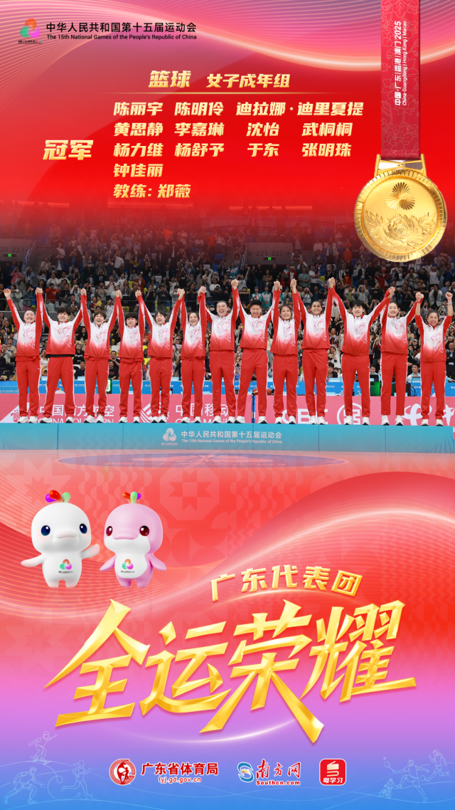 11月12日晚,在十五运会男篮五人成年组的决赛中,广东队时隔12年再次将全运会男篮分量最重的那块金牌收入囊中。如今,广东队又将全运会女篮分量最重的金牌摘下。