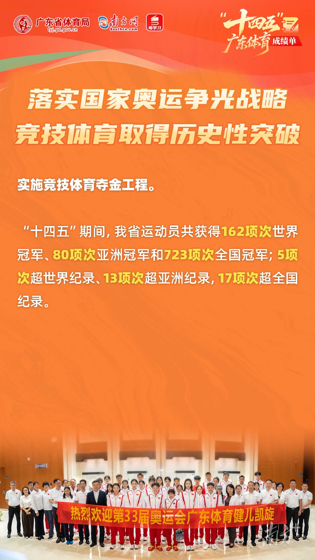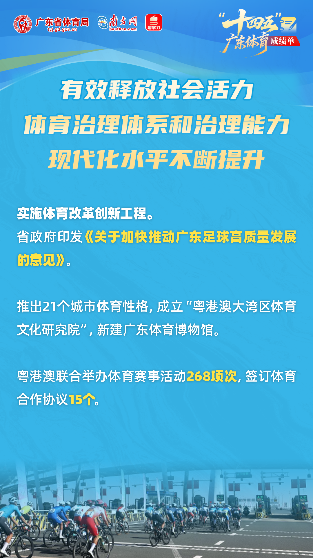 “十四五”以来,广东体育强省建设从夯基垒台到积厚成势,各项体育事业加力提速、纵深推进,展现新气象。