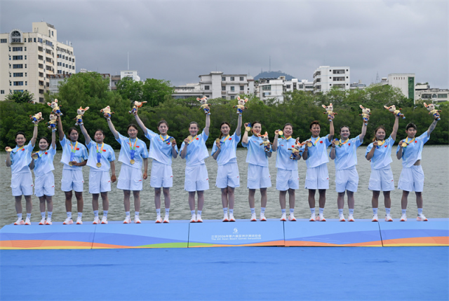 中国女队以广东佛山南海九江队为班底,她们在决赛中以28.260秒的成绩夺冠。冲过终点那一刻,中国女队的姑娘们互相击掌庆贺。颁奖仪式后,平均年龄24岁的她们手捧吉祥物“亚亚”、嘴咬金牌,举起手机自拍,享受这一最难忘、最美的瞬间。
