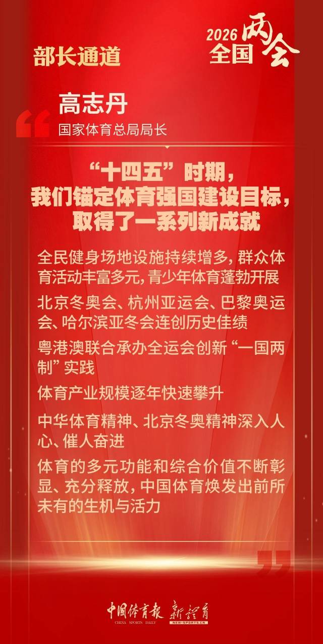 3月9日,十四届全国人大四次会议“部长通道”上,国家体育总局局长高志丹就“十五五”体育发展新举措、体育产业高质量发展等社会关心的问题回答记者提问,系统阐述未来体育工作的发展方向与实践路径,为加快推进体育强国建设凝聚共识、擘画蓝图。体育强国建设道路上,每个人都是参与者、实践者、见证者,希望大家一起携手努力,共建体育强国!