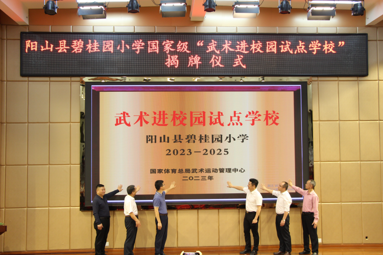 广州体育学院武术学院党委书记吴东昇(左三)、阳山县委副书记蔡展鹏(右三)、清远市教育局体卫艺科科长杨峰(左二)、阳山县教育局副局长张志锋(左一)、阳山县人民政府办公室副主任陈振豪(右二)和胡国坚校长(右一)共同揭开“武术进校园试点学校”的牌匾