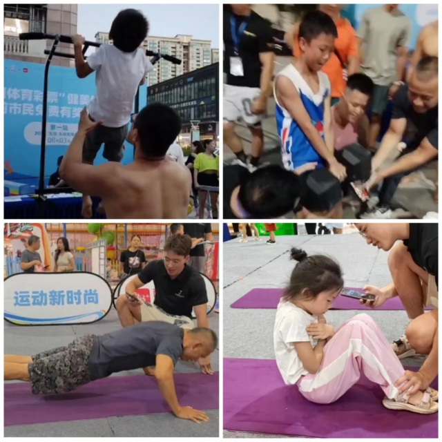 现场氛围火爆,多位“民间高手”出圈,老人小孩齐上阵,参与挑战的市民朋友中上至65岁下至4岁都展现出“气吞万里如虎”之势,最小的成功挑战者年仅7岁,围观群众纷纷叫好!还有11岁小孩手提哑铃超额完成挑战任务,中年大叔1分钟完成100个俯卧撑,点燃全场氛围!