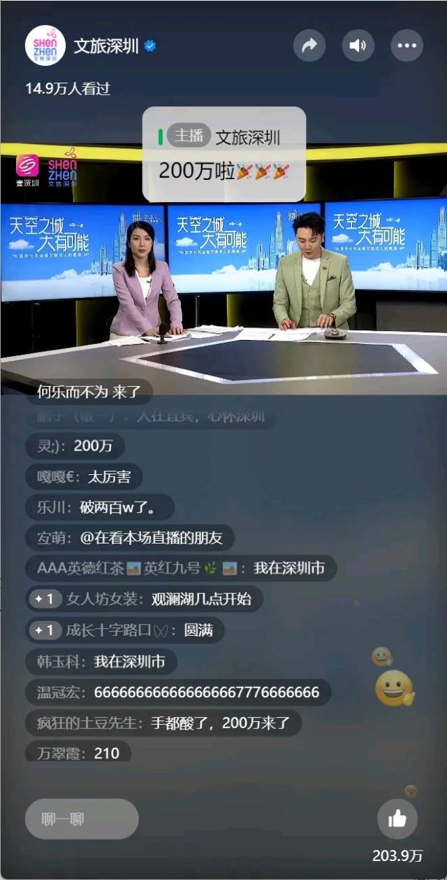 10月6日晚,2000架无人机在福田区笔架山体育公园上空精彩亮相,组合成“预祝福田成功创建国家全民运动健身模范区”造型,以实际行动践行“奋进新征程 运动促健康”的都市体育生活理念。活动现场观看人数超10万人,在“文旅深圳”视频号直播点赞量高达215.9万。