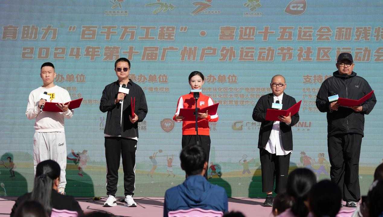 在舞台上,来自太平镇信诚木棉小学的同学们献上了合唱节目《荔枝红了》。两届蹦床世界冠军蔡琪子与群众代表一起宣读全民健身倡议书,号召大家走出户外,迎接阳光,乐享运动和美好生活,以饱满的精神状态迎接明年全国第十五届运动会和残特奥会的到来。广州市群众体育指导中心副主任林伟强、太平镇人民政府副镇长马燕梅、世界冠军蔡琪子等领导嘉宾鸣响汽笛,宣布本站社区运动会正式启动。