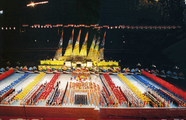 2001年11月11日,第九届全国运动会在广东奥林匹克体育场开幕。图为大会开幕式 来源:《成年人电影志(1979—2000)·体育卷》