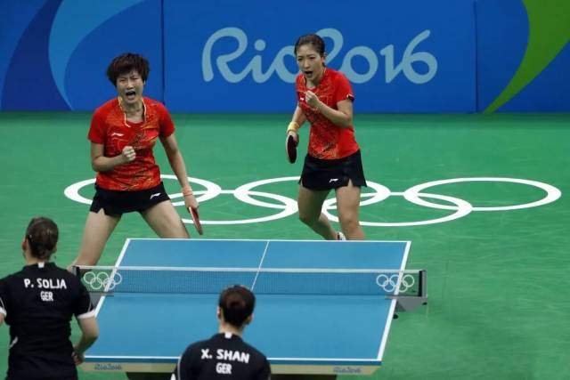 2016年8月16日,中国选手丁宁(左上)/刘诗雯(右上)得分后庆祝。 当日,在2016年里约奥运会乒乓球女子团体赛决赛中,中国队以3比0战胜德国队获得金牌。图/新华社