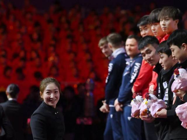 2024年2月25日,国际乒联运动员委员会主席刘诗雯(左)作为颁奖嘉宾出席国际乒联釜山世界乒乓球团体锦标赛男子团体颁奖仪式。图/新华社