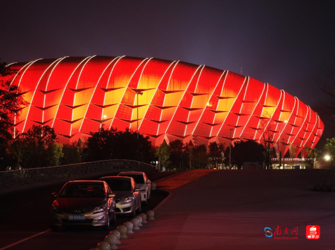 夜幕降临,清远体育中心主体育场被彩色灯光包裹,绚丽夺目。场馆内,工作人员正紧锣密鼓地布置舞台、调试设备、彩排合练,为即将举行的省运会开幕式做好准备。