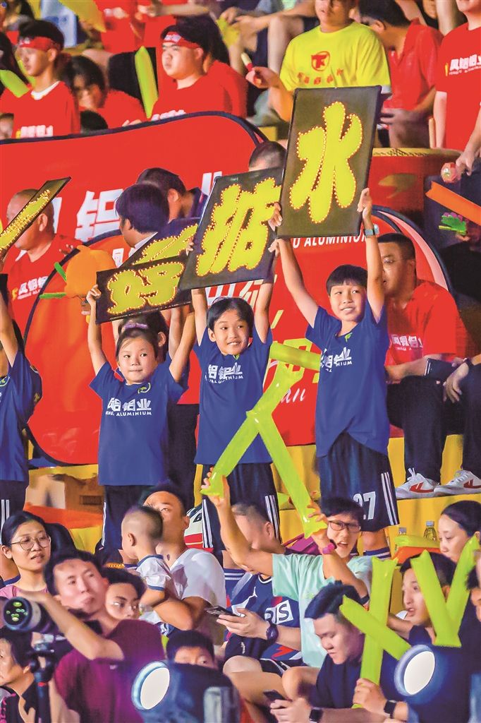 8月5日,佛山“西甲”揭幕战中,广东凤铝队的小球迷为球队加油助威
