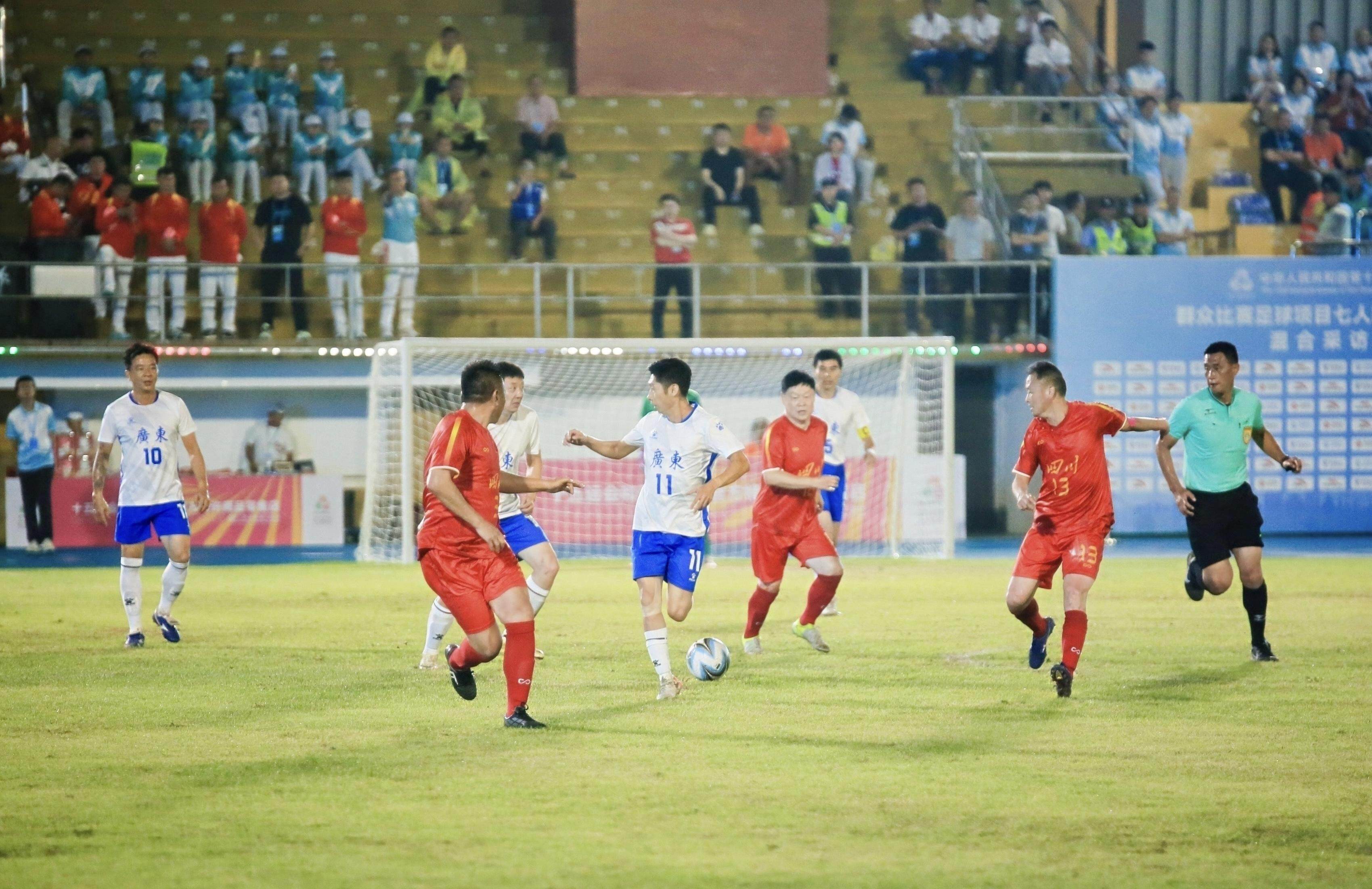 点球大战中,广东队顶住压力,5轮罚球弹无虚发,以5比4力压新疆生产建设兵团代表队,以总比分6比5战胜对手夺得甲组冠军,这也是十五运会群众七人足球赛首枚金牌。