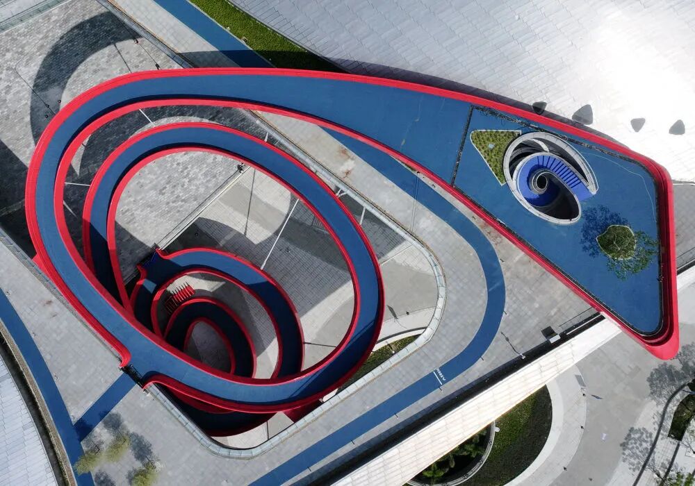 ↑深圳市光明区虹桥公园(10月25日摄,无人机照片)。全运会自由式小轮车比赛在这里举行。新华社记者 梁旭 摄