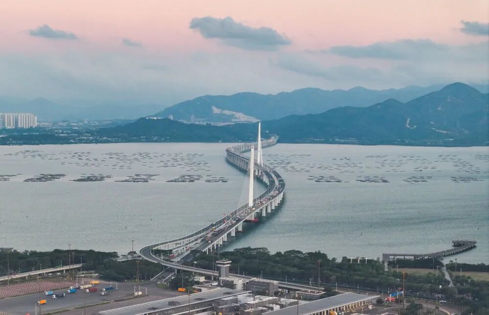 ↑晨曦中的港珠澳大桥和蓝海豚岛(10月19日摄,无人机照片)。港珠澳大桥是全运会公路自行车项目途经地,一桥串联粤港澳三地。新华社记者 毛思倩 摄