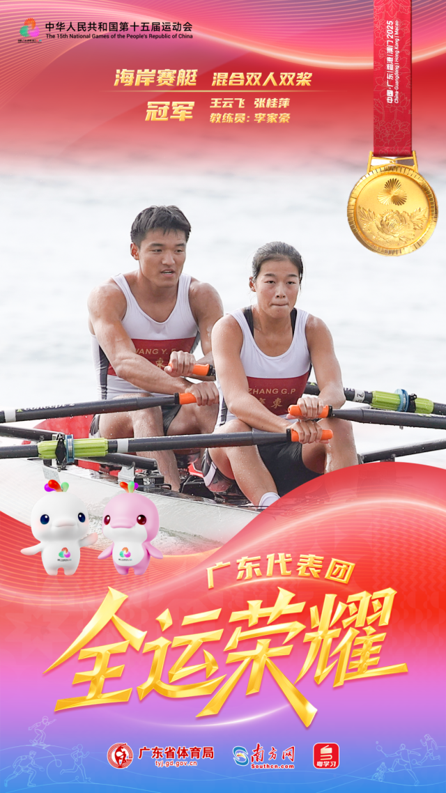 在11月16日上午结束的十五运会海岸赛艇混合双人双桨决赛中,广东运动员王云飞、张桂萍战胜对手,勇夺冠军这不仅是本届全运会的首枚海岸赛艇金牌,也是全运会历史上首枚海岸赛艇项目金牌。