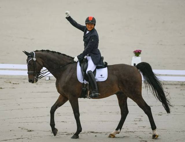 2021年9月18日,顾兵在第十四届全国运动会马术盛装舞步个人赛后庆祝夺冠。图/新华社