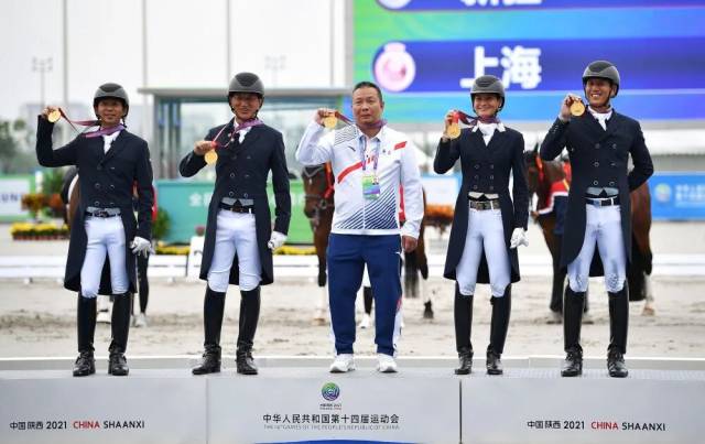 2021年9月16日,冠军广东队选手黄焯钦(左一)、顾兵(左二)、黄丽兴(右二)、谭志勤(右一)和教练员罗东斌(中)在第十四届全国运动会马术盛装舞步团体赛颁奖仪式上。图/新华社