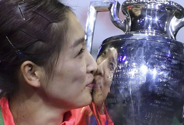 2019年4月27日,刘诗雯在匈牙利布达佩斯世乒赛女单颁奖仪式上亲吻冠军奖杯。图/新华社