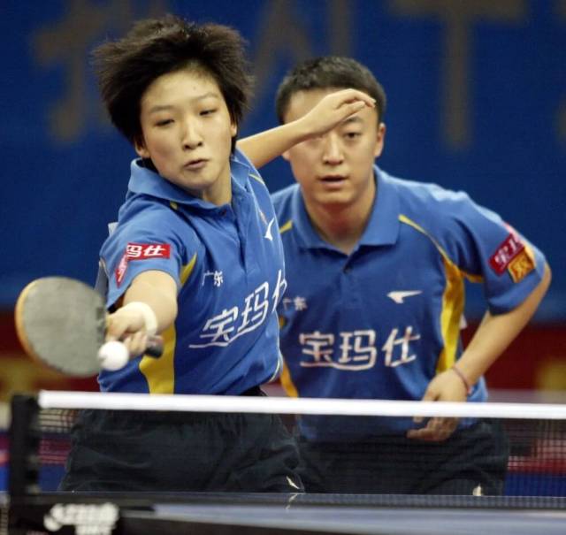 2005年10月15日,广东队选手马琳/刘诗雯(左)在第十届全国运动会乒乓球混双比赛中。图/新华社
