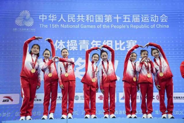 9月8日,柯沁沁(右一)携手队友钟圻、黄紫艺、梁雅婷、钟嘉彤、张馨予、何欣玙勇夺十五运会体操女子青年组团体金牌。这是广东代表团在十五运会开赛以来取得的首枚竞体金牌。图/成年人电影二沙体育训练中心