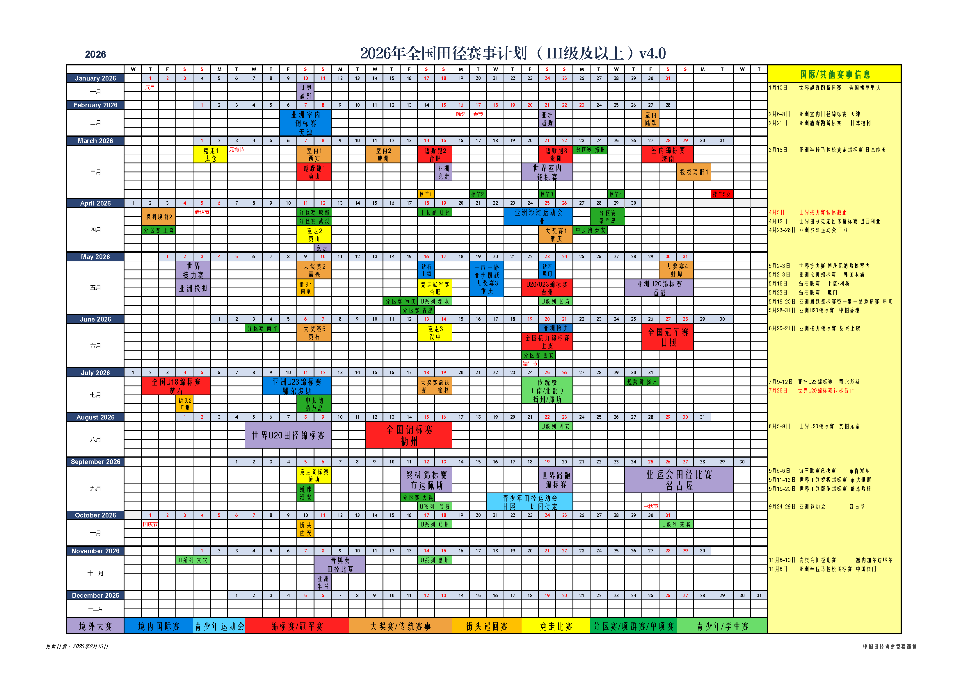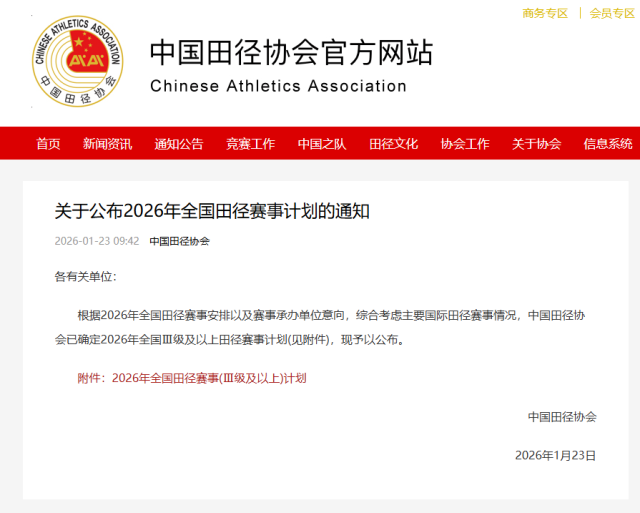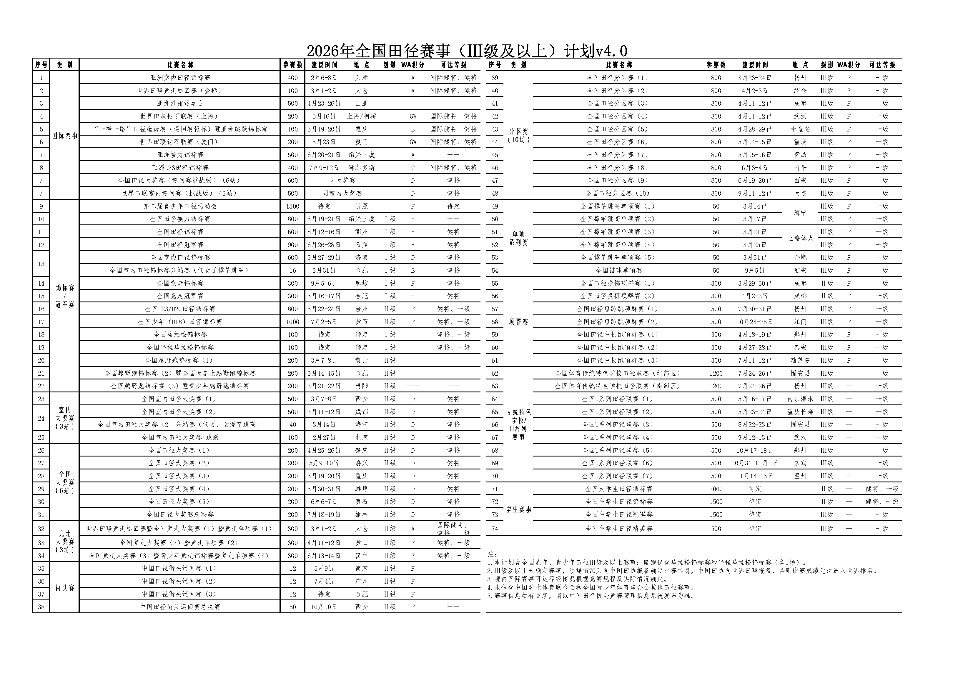 根据2026年全国田径赛事安排以及赛事承办单位意向,综合考虑主要国际田径赛事情况,中国田径协会已确定2026年全国Ⅲ级及以上田径赛事计划。