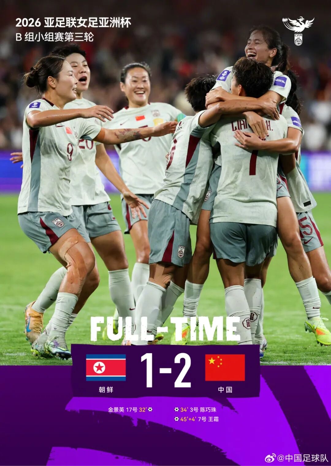北京时间3月9日,2026年女足亚洲杯小组赛B组最后一轮比赛展开角逐,中国女足迎战朝鲜女足,在上半场先失一球的情况下,中国队最终以2比1逆转战胜对手,豪取三连胜,锁定B组第一,晋级八强!4名广东女将出战,其中陈巧珠攻入一粒精彩进球。