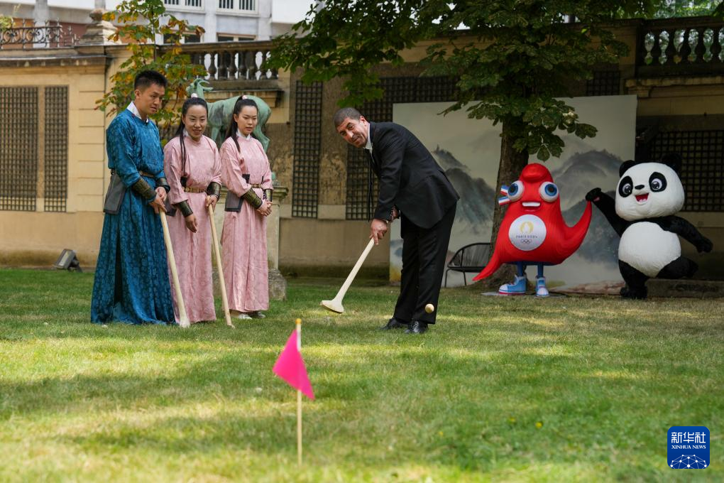 7月24日,一位工作人员(右一)在巴黎奥运会“中国之家”体验传统体育活动“捶丸”(图/新华社)