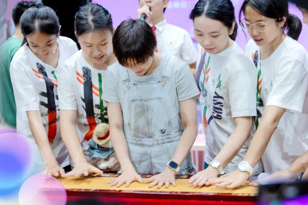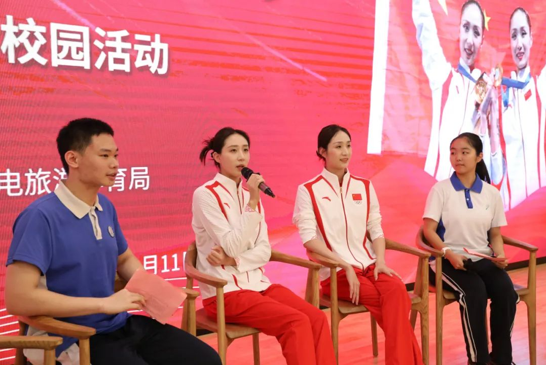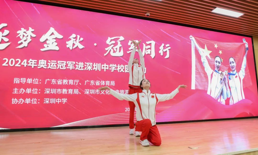 风采展示环节上,王柳懿、王芊懿重现巴黎奥运会花样游泳比赛入水前的招牌动作——豹子步,两位深中学子在现场进行学习和展示,获得奥运冠军们的高度赞扬。